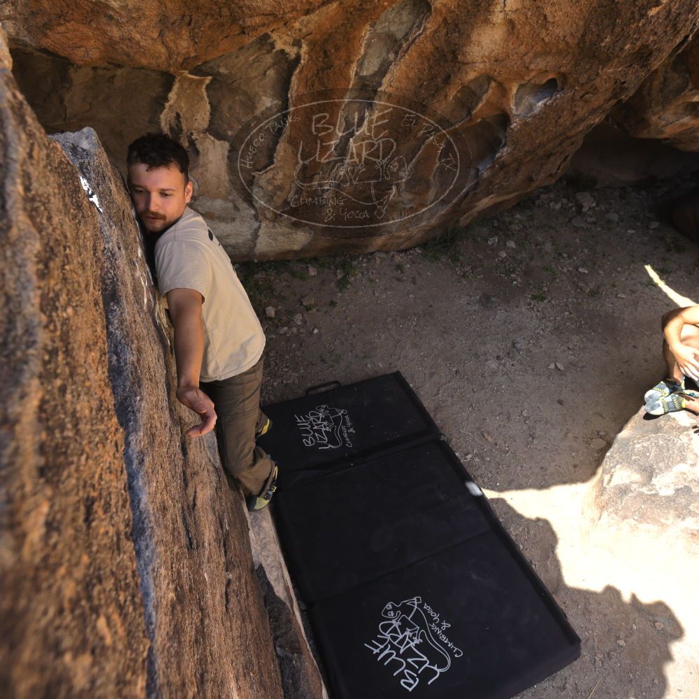 Blue Lizard Climbing and Yoga Hueco Tanks guiding on April 8, 2022, with Andrew, Cadzie, Matt, Matteo, Morgan, and Oscar |
