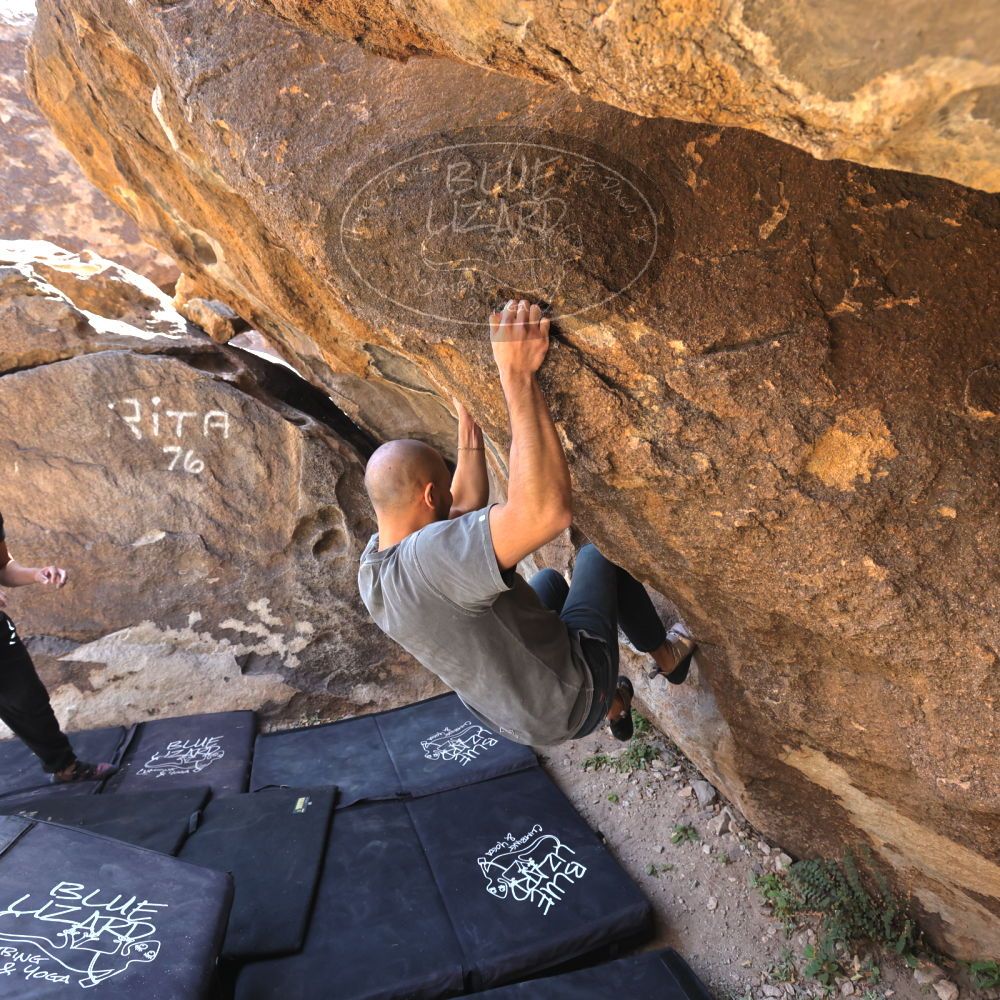 Blue Lizard Climbing and Yoga Hueco Tanks guiding on April 8, 2022, with Andrew, Cadzie, Matt, Matteo, Morgan, and Oscar