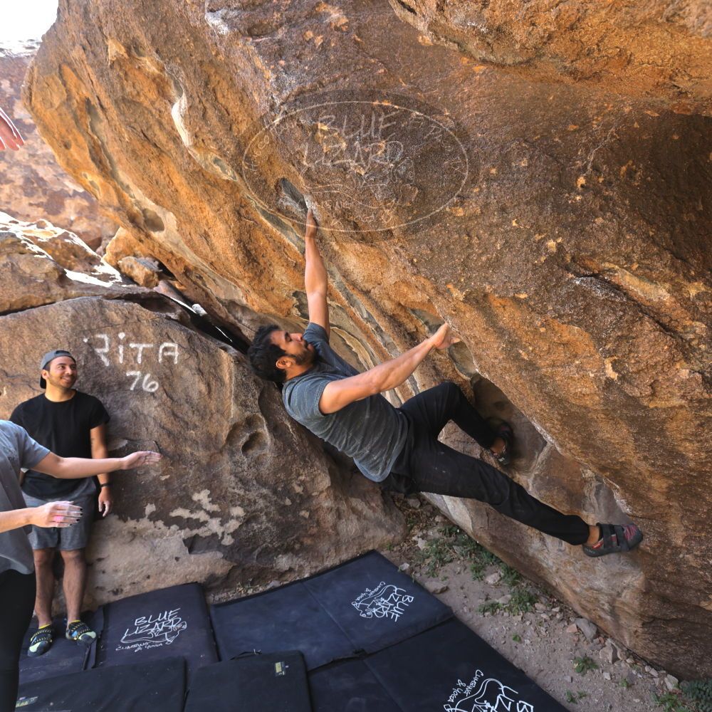Blue Lizard Climbing and Yoga Hueco Tanks guiding on April 8, 2022, with Andrew, Cadzie, Matt, Matteo, Morgan, and Oscar |