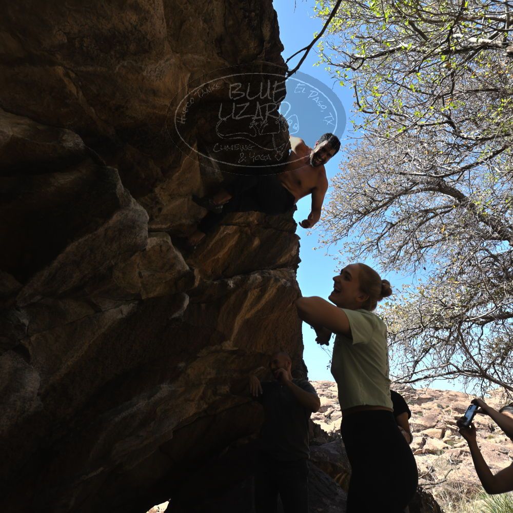 Blue Lizard Climbing and Yoga Hueco Tanks guiding on April 8, 2022, with Andrew, Cadzie, Matt, Matteo, Morgan, and Oscar |