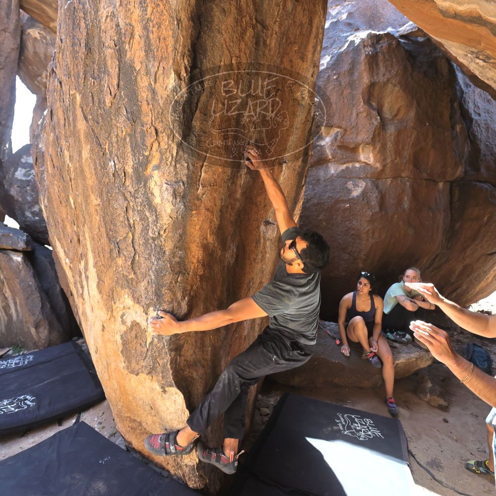 Blue Lizard Climbing and Yoga Hueco Tanks guiding on April 8, 2022, with Andrew, Cadzie, Matt, Matteo, Morgan, and Oscar |