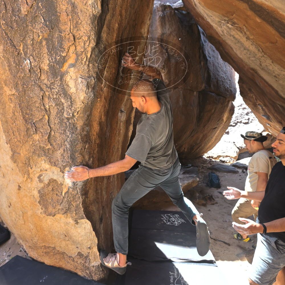 Blue Lizard Climbing and Yoga Hueco Tanks guiding on April 8, 2022, with Andrew, Cadzie, Matt, Matteo, Morgan, and Oscar |