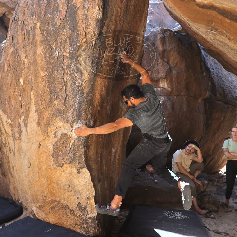 Blue Lizard Climbing and Yoga Hueco Tanks guiding on April 8, 2022, with Andrew, Cadzie, Matt, Matteo, Morgan, and Oscar |