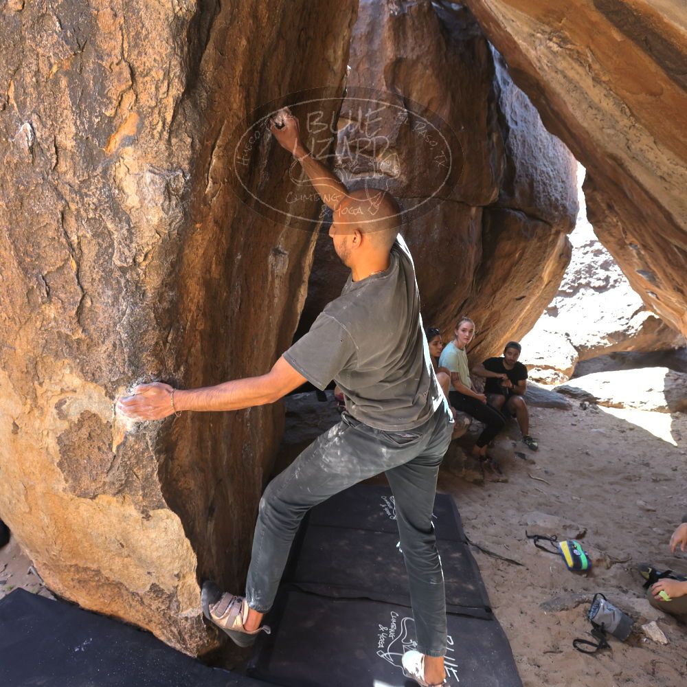 Blue Lizard Climbing and Yoga Hueco Tanks guiding on April 8, 2022, with Andrew, Cadzie, Matt, Matteo, Morgan, and Oscar |