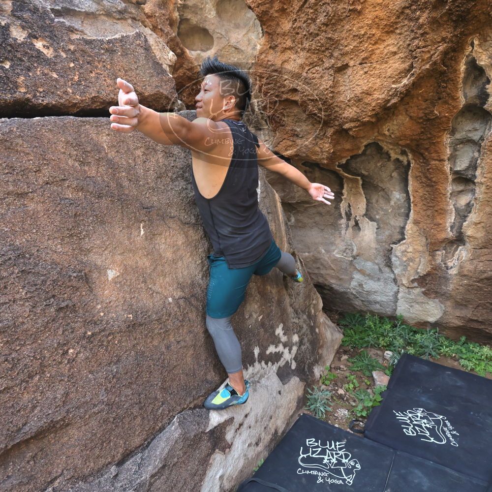 Blue Lizard Climbing and Yoga Hueco Tanks guiding on October 22, 2022, with Anna & Eric, David, Kevin, Jasmine, Justin, and Vic |