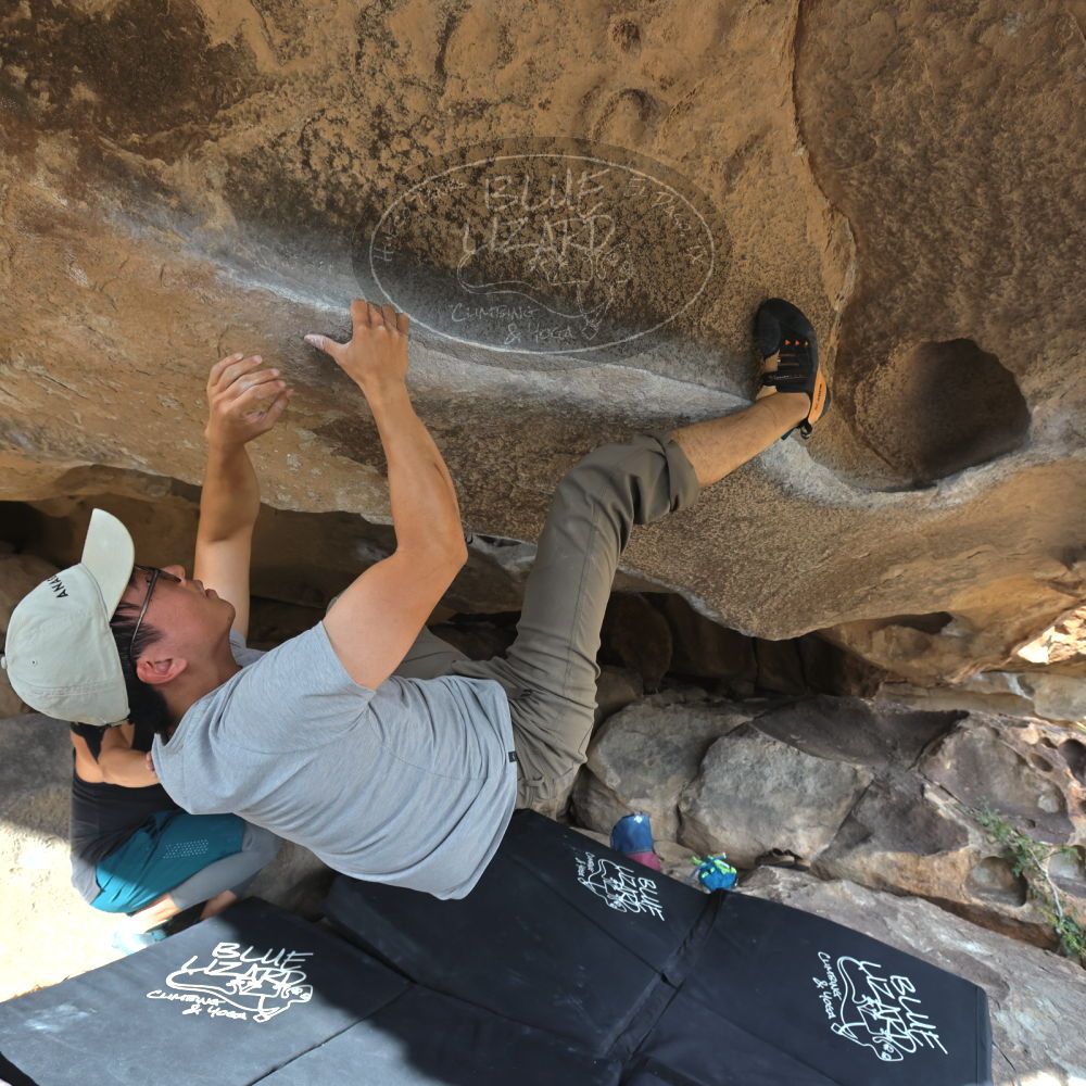 Blue Lizard Climbing and Yoga Hueco Tanks guiding on October 22, 2022, with Anna & Eric, David, Kevin, Jasmine, Justin, and Vic |