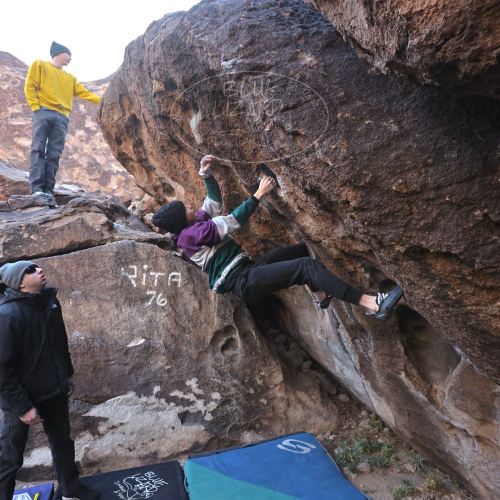 Blue Lizard Climbing and Yoga Hueco Tanks guiding on December 16, 2022, with Emma, Ethan, Isaac, Keith, and Nathan