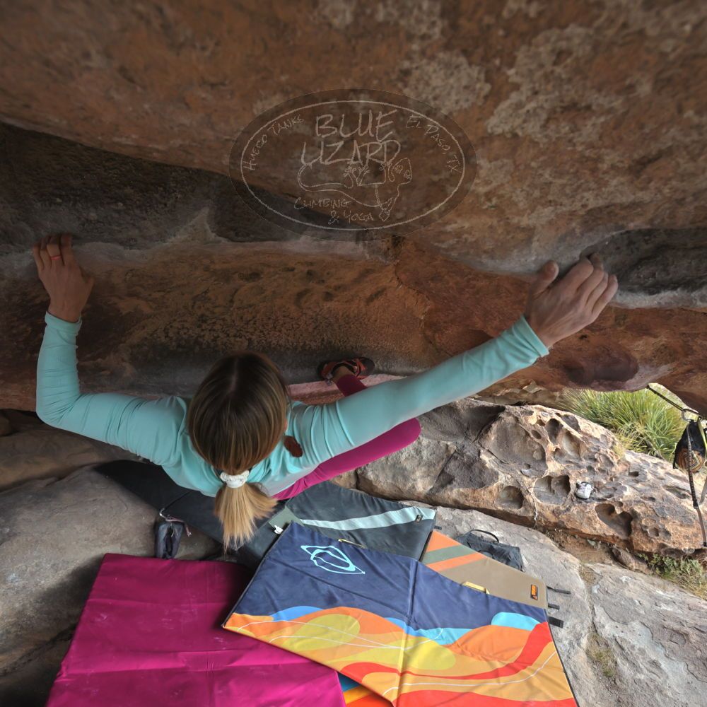 Blue Lizard Climbing and Yoga Hueco Tanks guiding on January 15, 2023, with Anthony, Fern, Ginger, Greg, Joanie, and Sophie & Kieran |