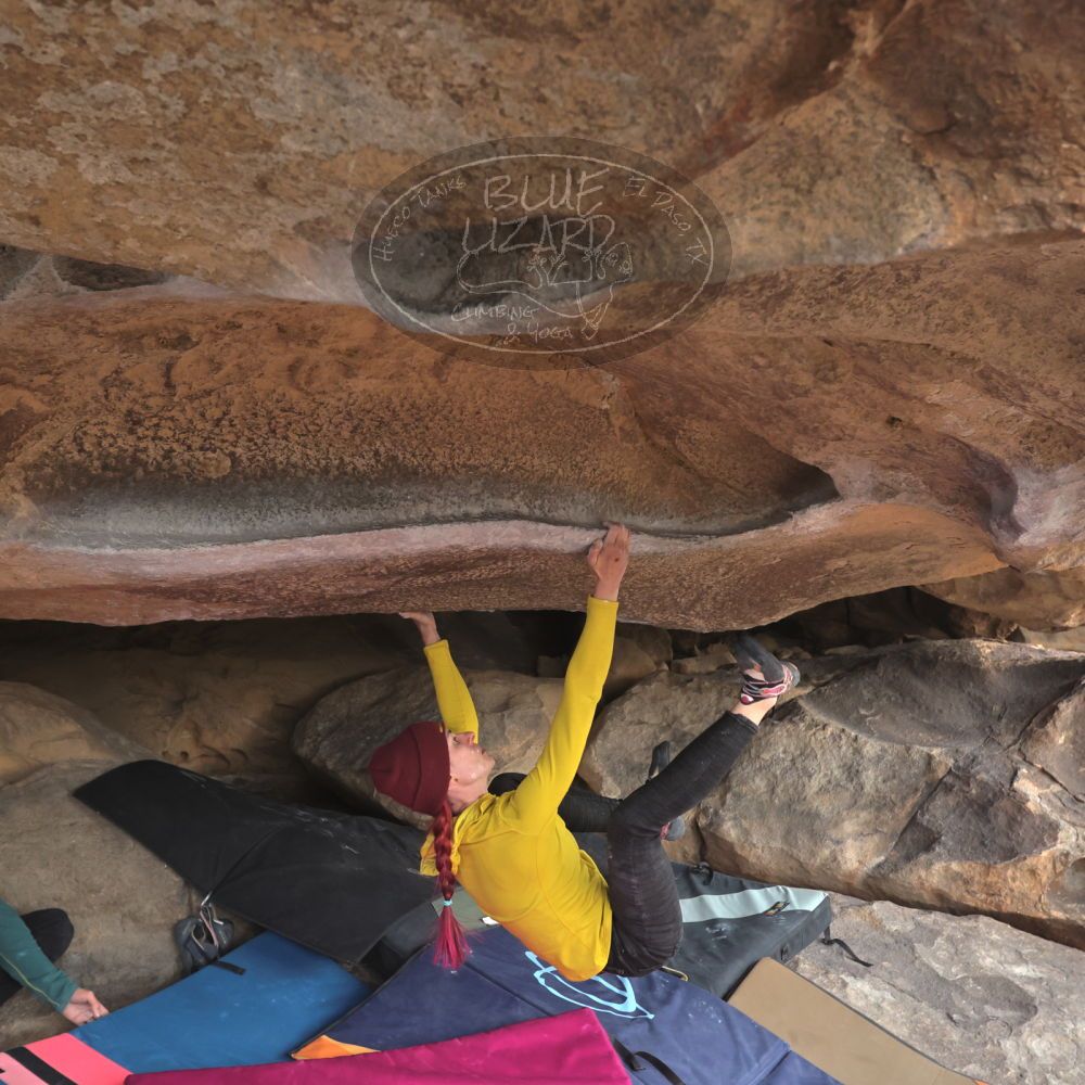 Blue Lizard Climbing and Yoga Hueco Tanks guiding on January 15, 2023, with Anthony, Fern, Ginger, Greg, Joanie, and Sophie & Kieran |