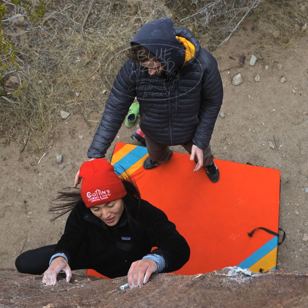 Blue Lizard Climbing and Yoga Hueco Tanks guiding on January 15, 2023, with Anthony, Fern, Ginger, Greg, Joanie, and Sophie & Kieran |