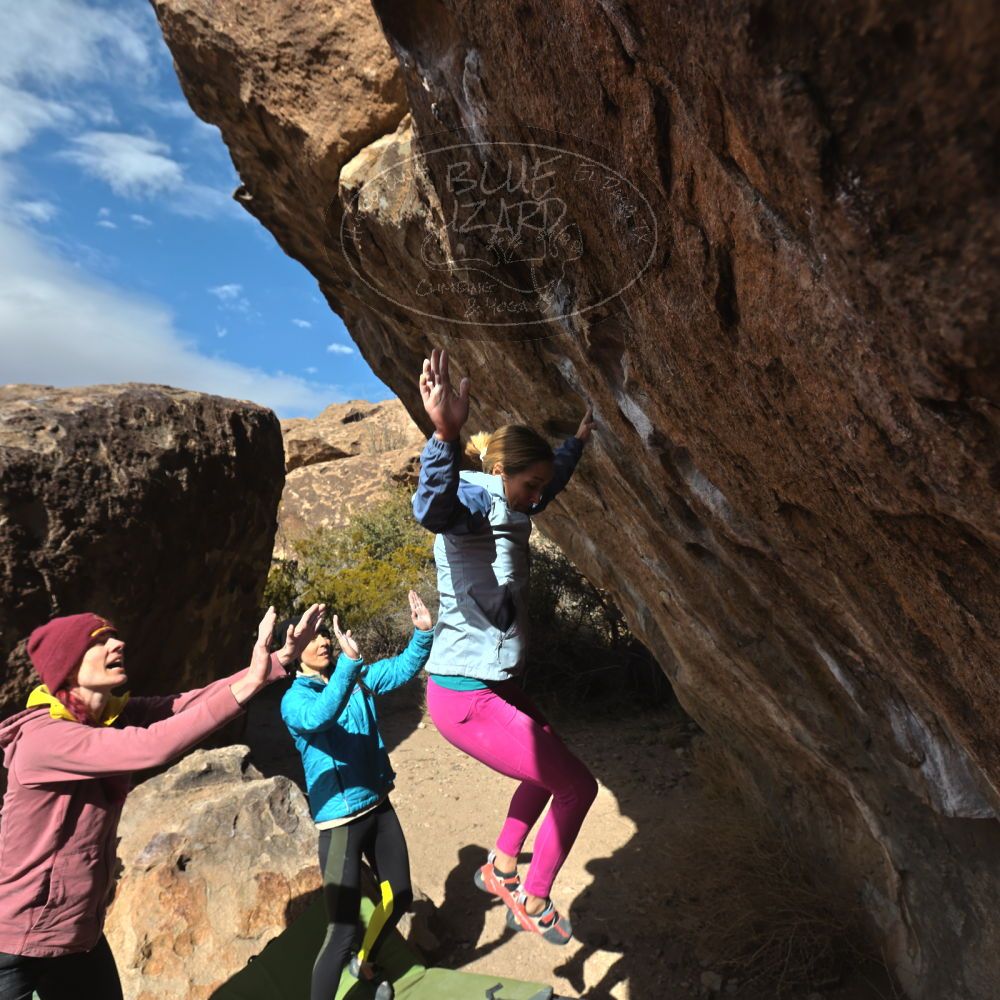 Blue Lizard Climbing and Yoga Hueco Tanks guiding on January 15, 2023, with Anthony, Fern, Ginger, Greg, Joanie, and Sophie & Kieran |