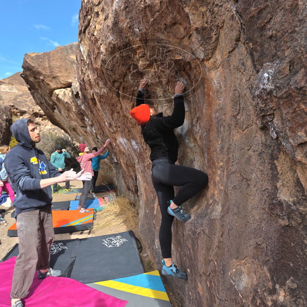 Blue Lizard Climbing and Yoga Hueco Tanks guiding on January 15, 2023, with Anthony, Fern, Ginger, Greg, Joanie, and Sophie & Kieran |