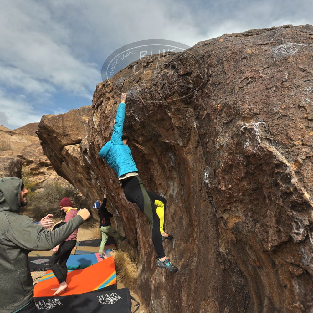 Blue Lizard Climbing and Yoga Hueco Tanks guiding on January 15, 2023, with Anthony, Fern, Ginger, Greg, Joanie, and Sophie & Kieran |