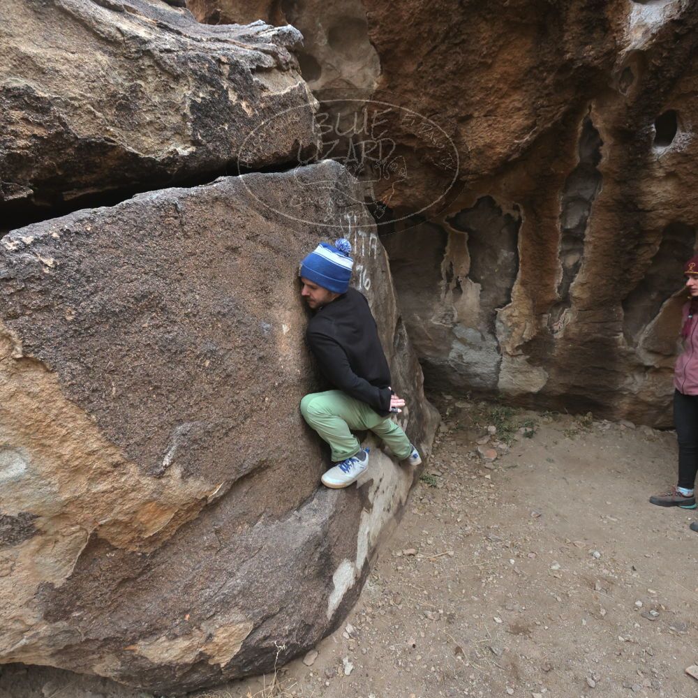 Blue Lizard Climbing and Yoga Hueco Tanks guiding on January 15, 2023, with Anthony, Fern, Ginger, Greg, Joanie, and Sophie & Kieran |