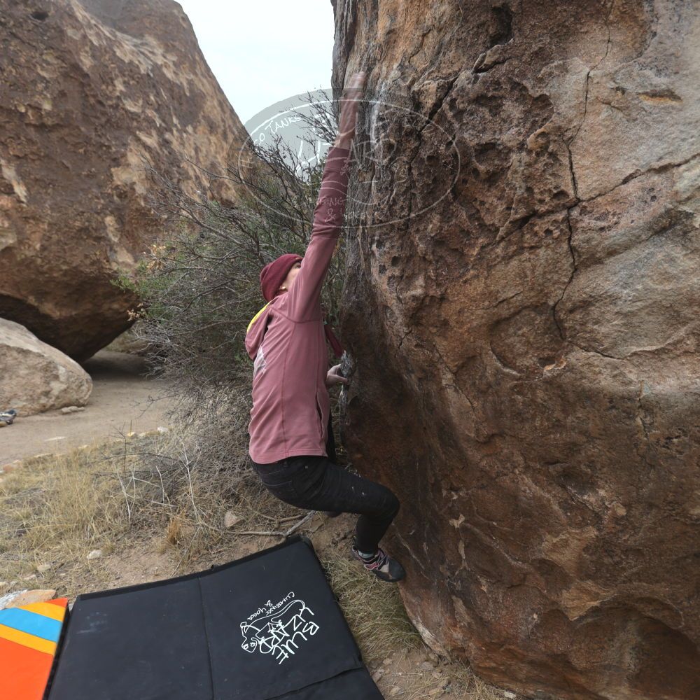 Blue Lizard Climbing and Yoga Hueco Tanks guiding on January 15, 2023, with Anthony, Fern, Ginger, Greg, Joanie, and Sophie & Kieran