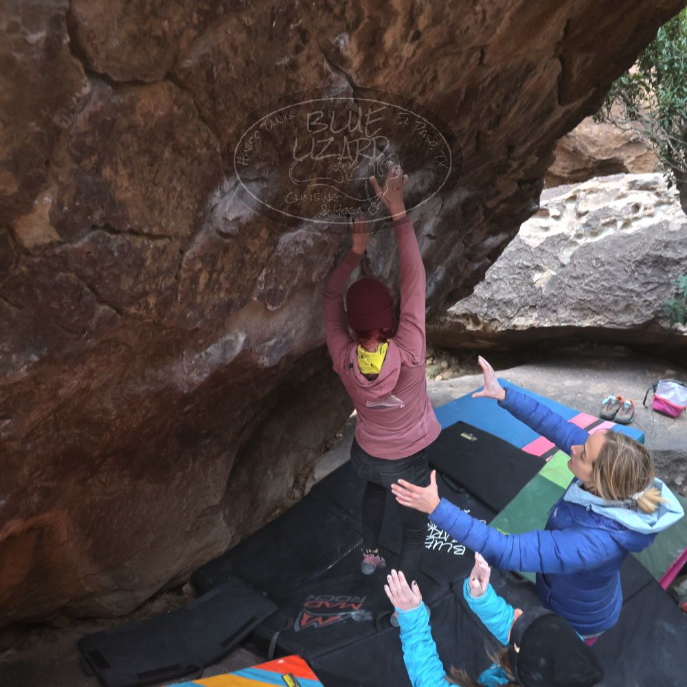 Blue Lizard Climbing and Yoga Hueco Tanks guiding on January 15, 2023, with Anthony, Fern, Ginger, Greg, Joanie, and Sophie & Kieran |