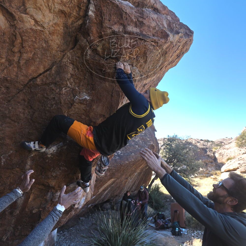 Blue Lizard Climbing and Yoga Hueco Tanks guiding on January 22, 2023 with Brian, Dave, Favia, Max, and Ozzy