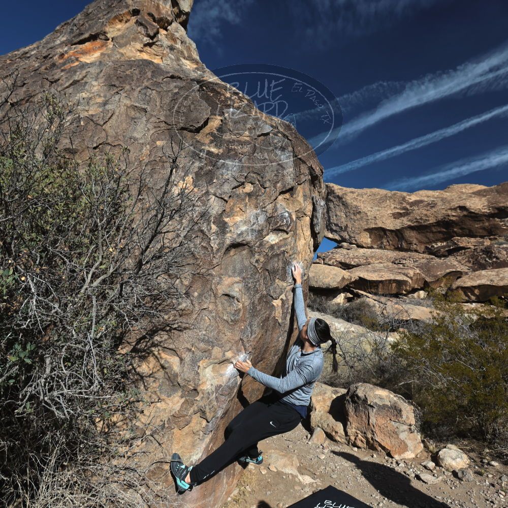 Blue Lizard Climbing and Yoga Hueco Tanks guiding on February 17, 2023, with Amelia, Crystal, Megan, and Steven