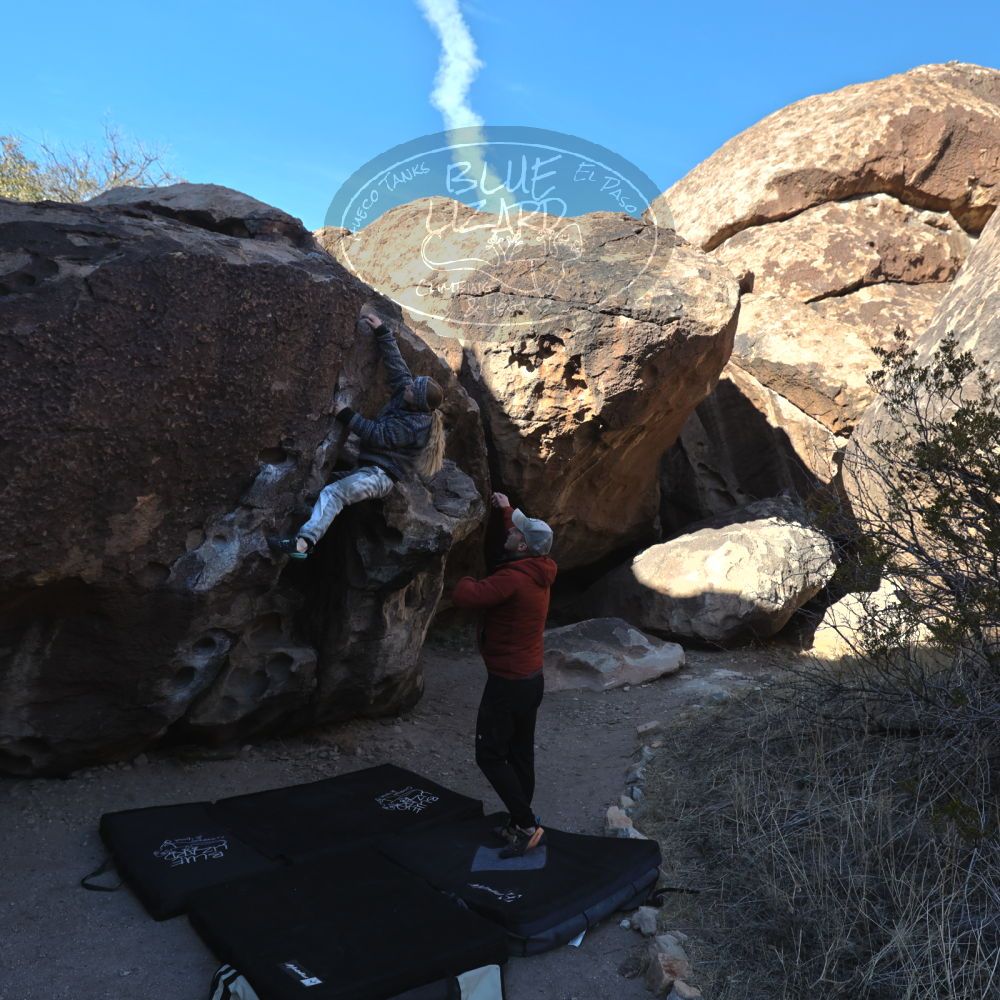 Blue Lizard Climbing and Yoga Hueco Tanks guiding on February 17, 2023, with Amelia, Crystal, Megan, and Steven