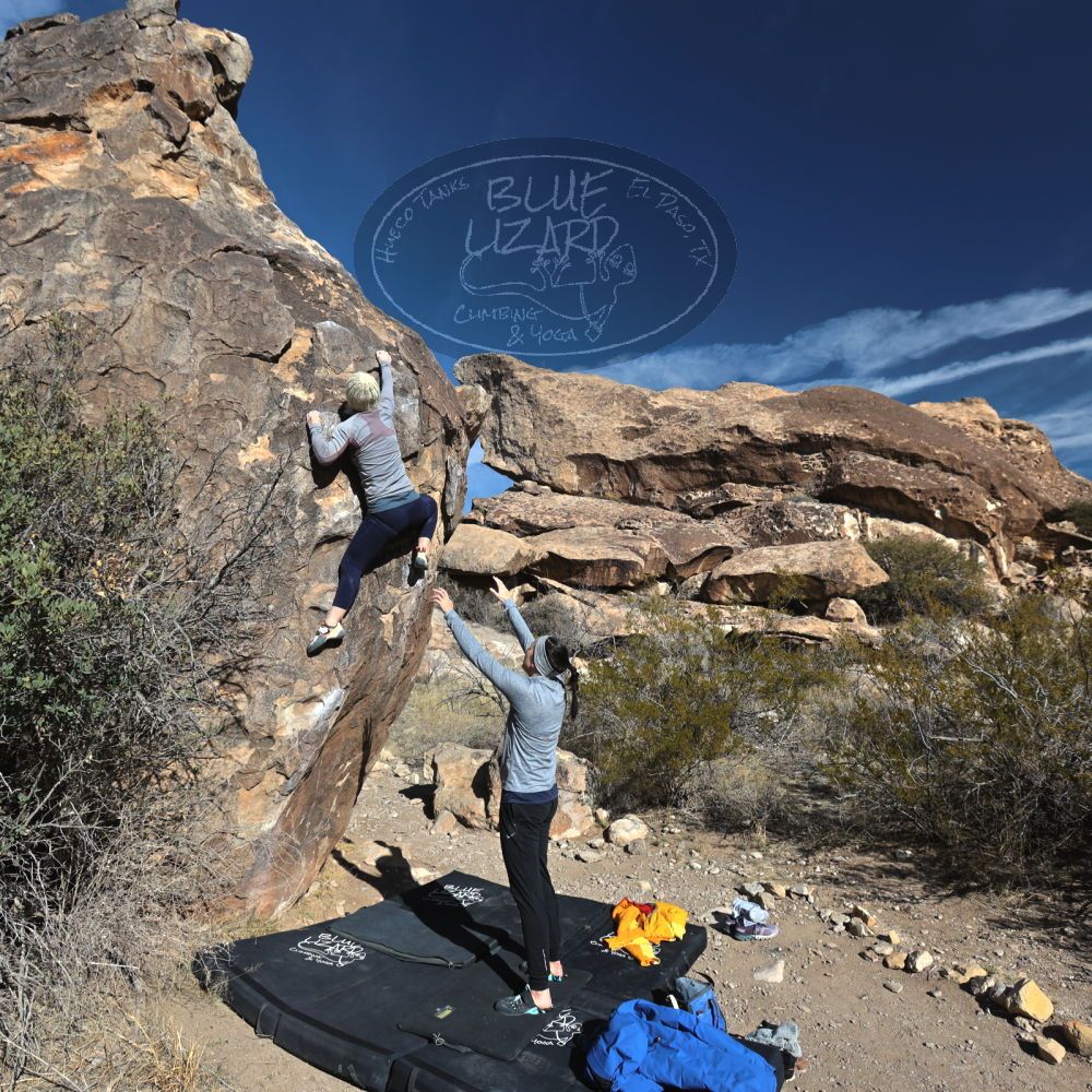 Blue Lizard Climbing and Yoga Hueco Tanks guiding on February 17, 2023, with Amelia, Crystal, Megan, and Steven