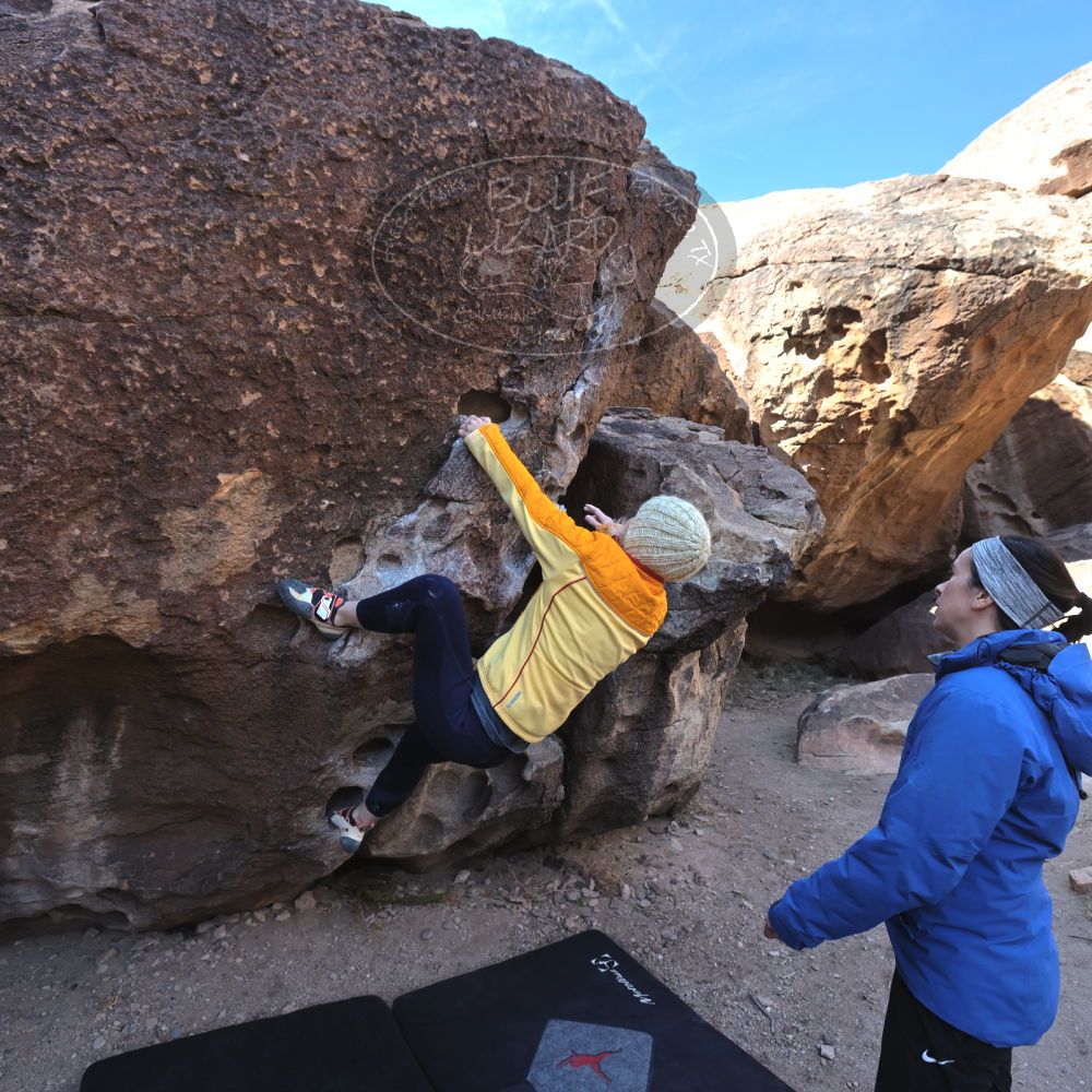 Blue Lizard Climbing and Yoga Hueco Tanks guiding on February 17, 2023, with Amelia, Crystal, Megan, and Steven