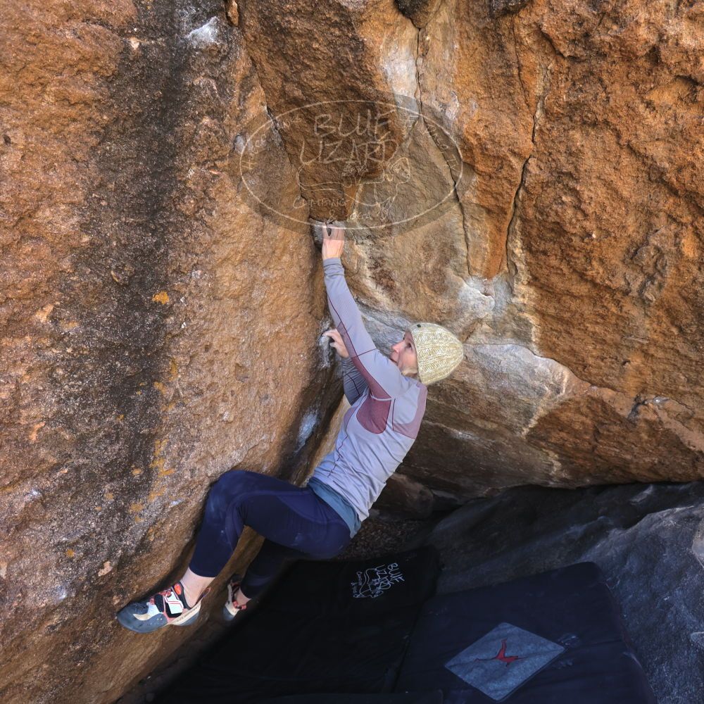 Blue Lizard Climbing and Yoga Hueco Tanks guiding on February 17, 2023, with Amelia, Crystal, Megan, and Steven