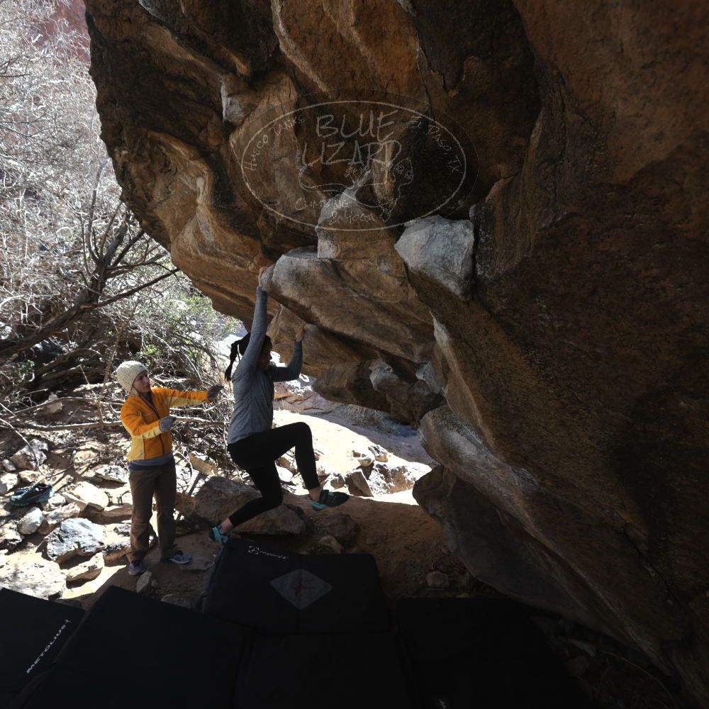 Blue Lizard Climbing and Yoga Hueco Tanks guiding on February 17, 2023, with Amelia, Crystal, Megan, and Steven