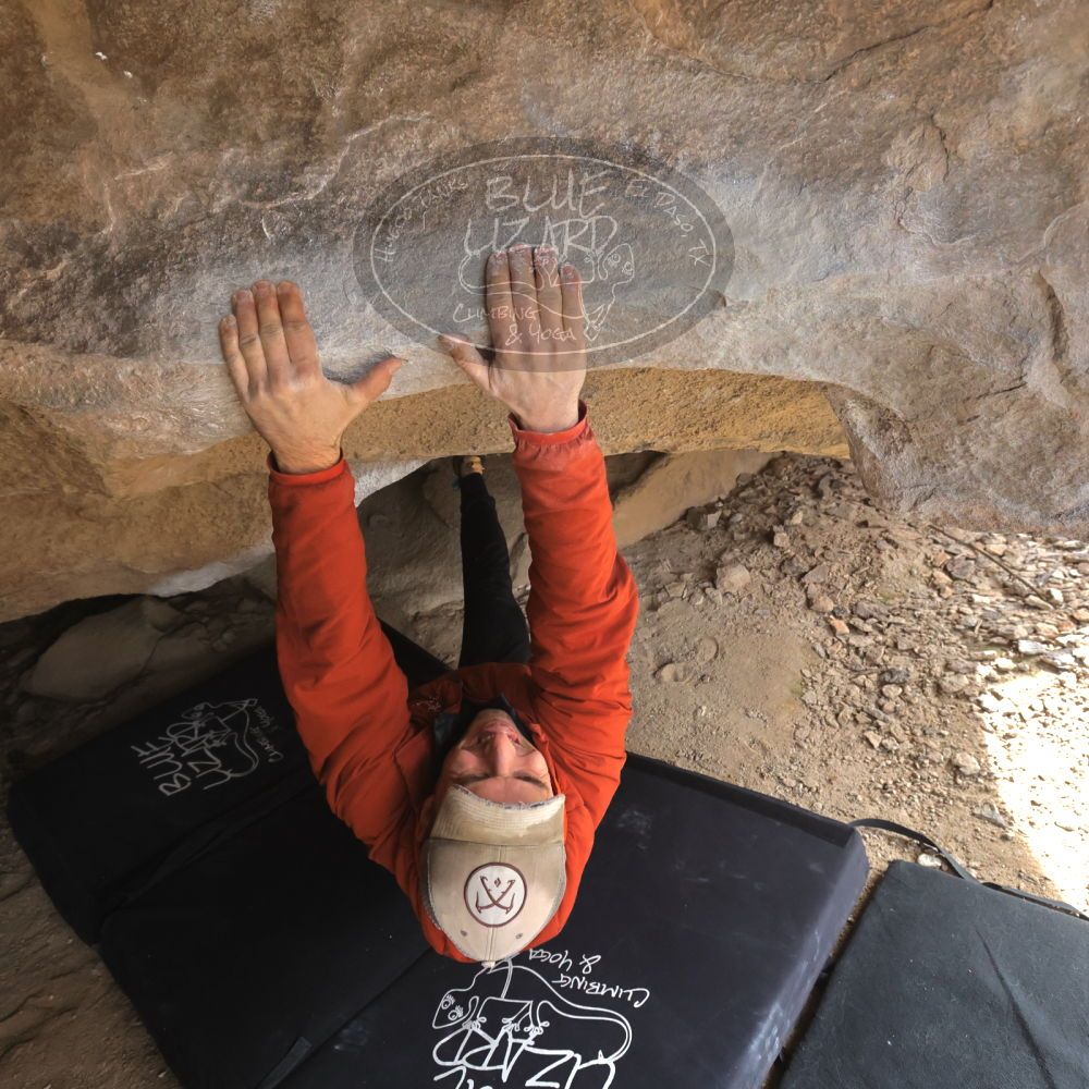 Blue Lizard Climbing and Yoga Hueco Tanks guiding on February 17, 2023, with Amelia, Crystal, Megan, and Steven