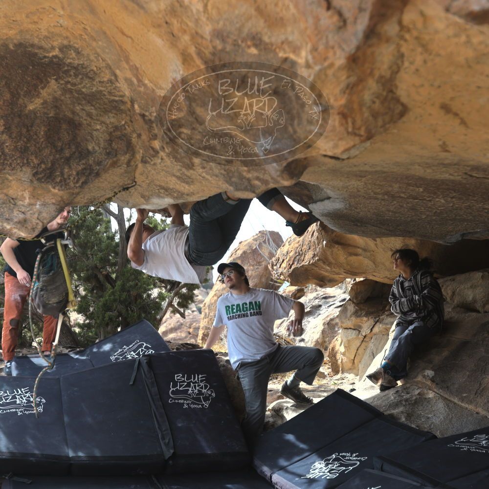 Blue Lizard Climbing and Yoga Hueco Tanks guiding on February 24, 2023, with Michael, Rachel, Rich, and Roy