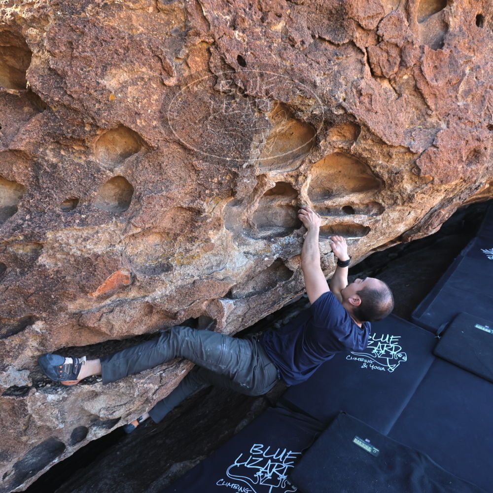 Blue Lizard Climbing and Yoga Hueco Tanks guiding on November 23, 2023, with Alex, Gabby, Joe, Santiago, and Sophia