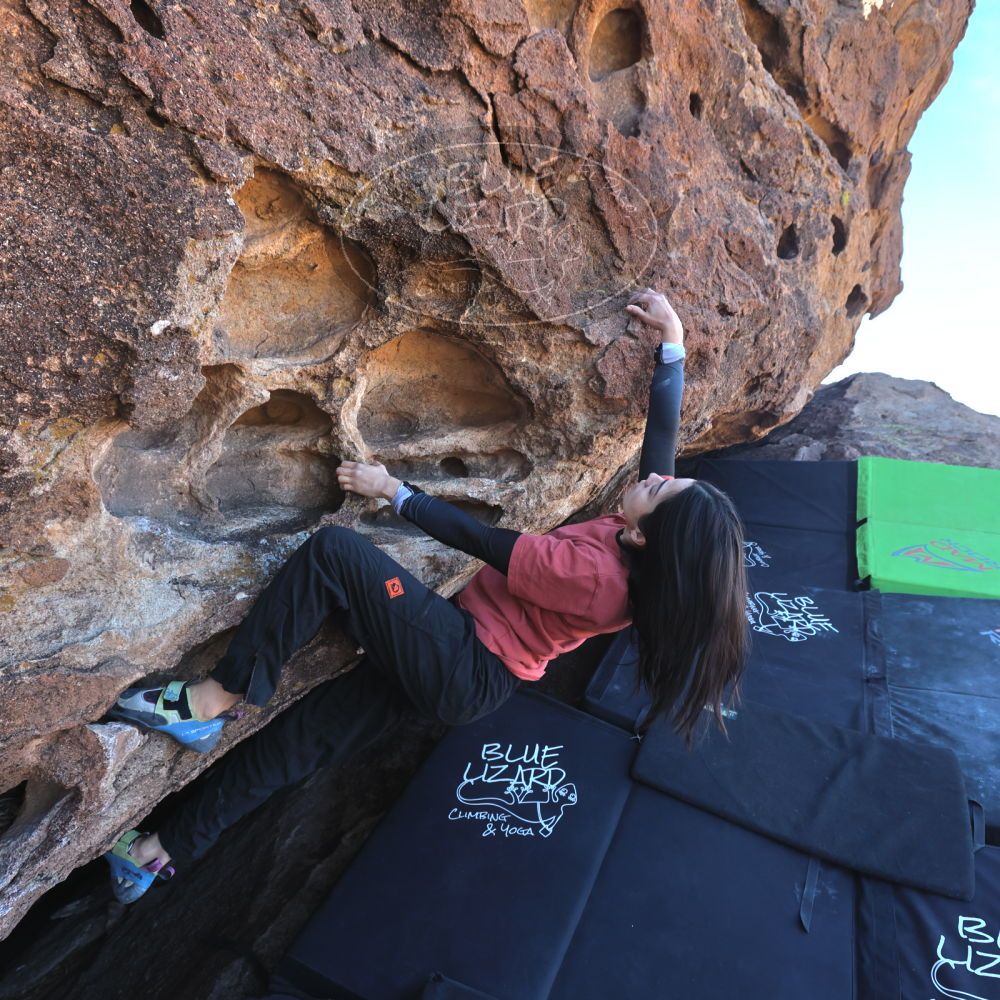 Blue Lizard Climbing and Yoga Hueco Tanks guiding on November 23, 2023, with Alex, Gabby, Joe, Santiago, and Sophia