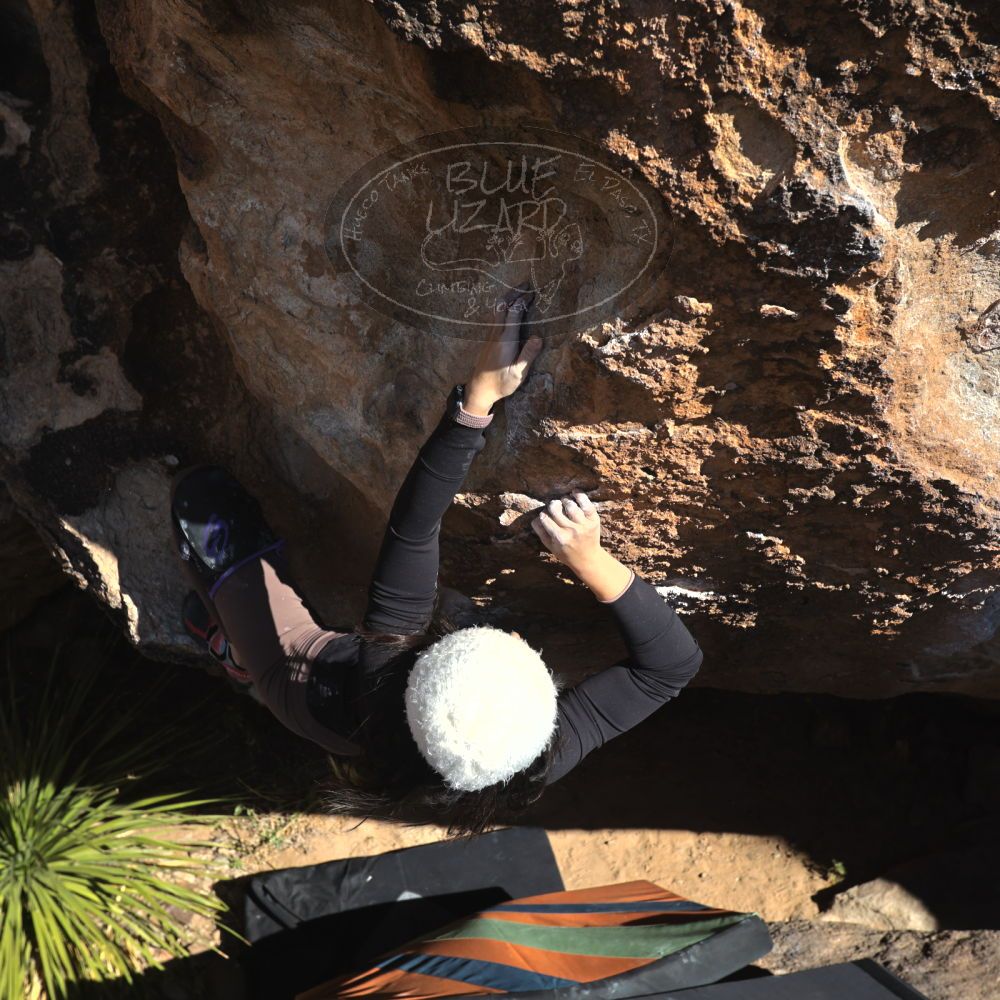 Blue Lizard Climbing and Yoga Hueco Tanks guiding on November 25, 2023, with Julie & Ryan, Megan & David, and Sophia