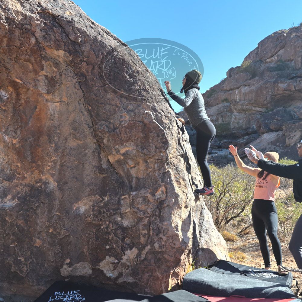 Blue Lizard Climbing and Yoga Hueco Tanks guiding on November 9, 2024, with Alayna, Anika, Becca, Britney