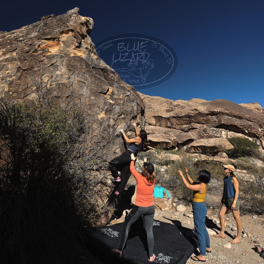 Blue Lizard Climbing and Yoga Hueco Tanks guiding on November 10, 2024, with Alayna, Anika, Becca, Britney, Alison