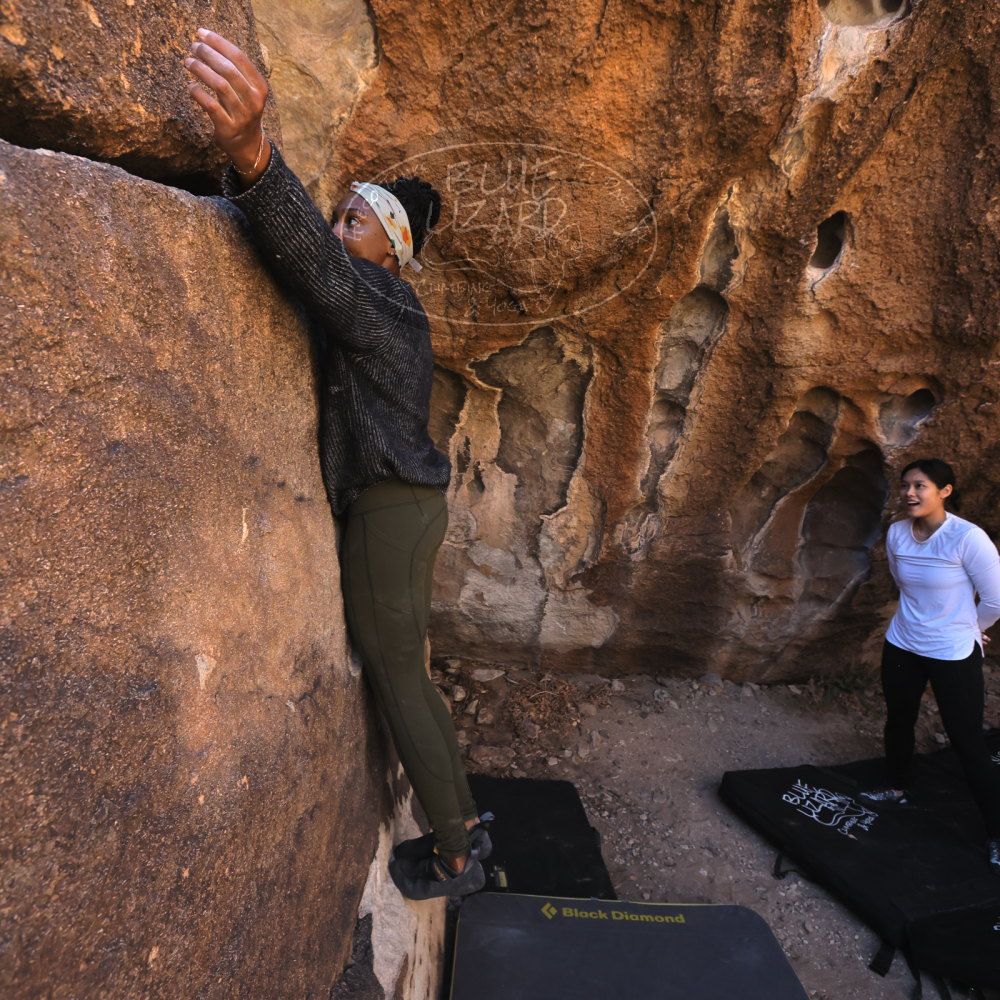 Blue Lizard Climbing and Yoga Hueco Tanks guiding on November 10, 2024, with Alayna, Anika, Becca, Britney, Alison