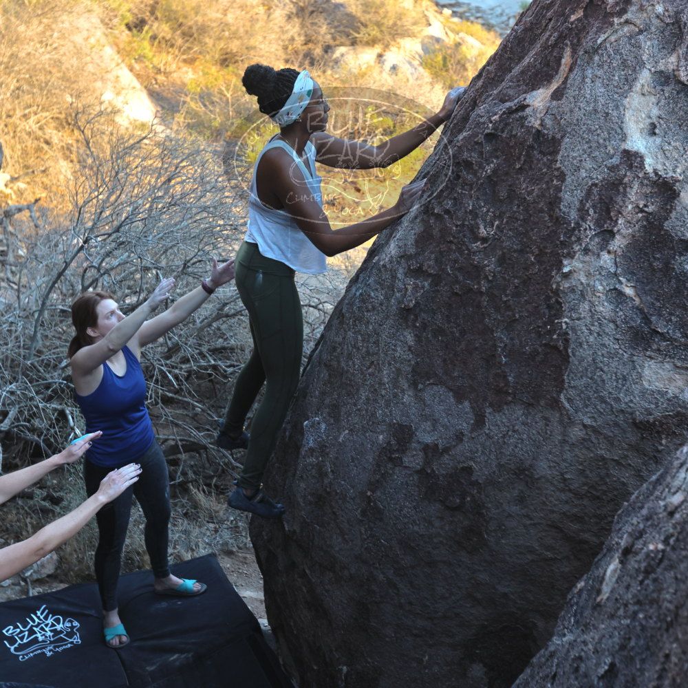 Blue Lizard Climbing and Yoga Hueco Tanks guiding on November 10, 2024, with Alayna, Anika, Becca, Britney, Alison