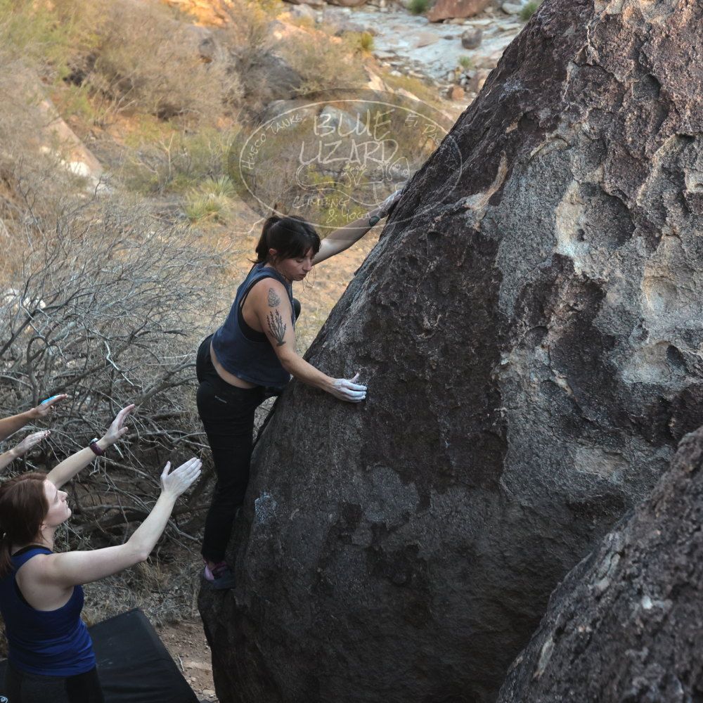 Blue Lizard Climbing and Yoga Hueco Tanks guiding on November 10, 2024, with Alayna, Anika, Becca, Britney, Alison