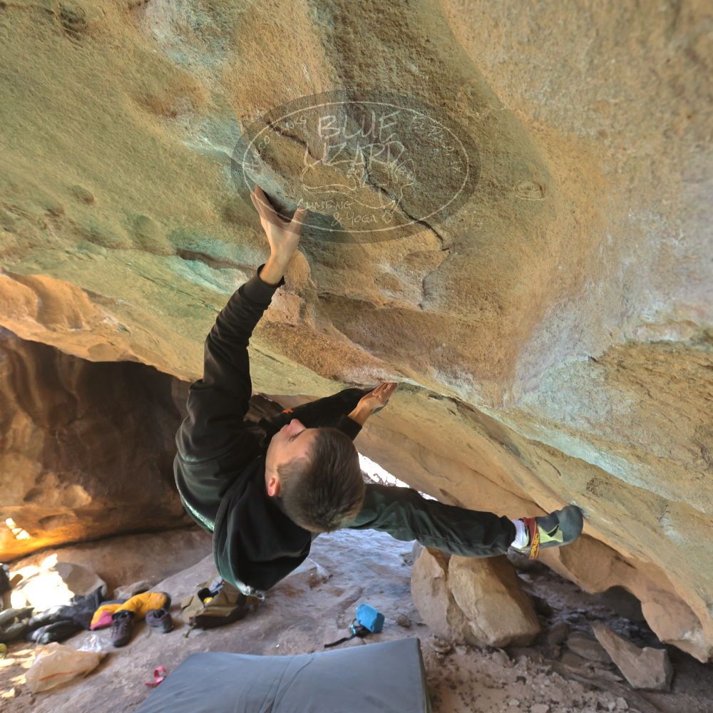 Blue Lizard Climbing and Yoga Hueco Tanks guiding on January 18, 2025, with Favia, Jordan, Spencer, Yibin, and Zach