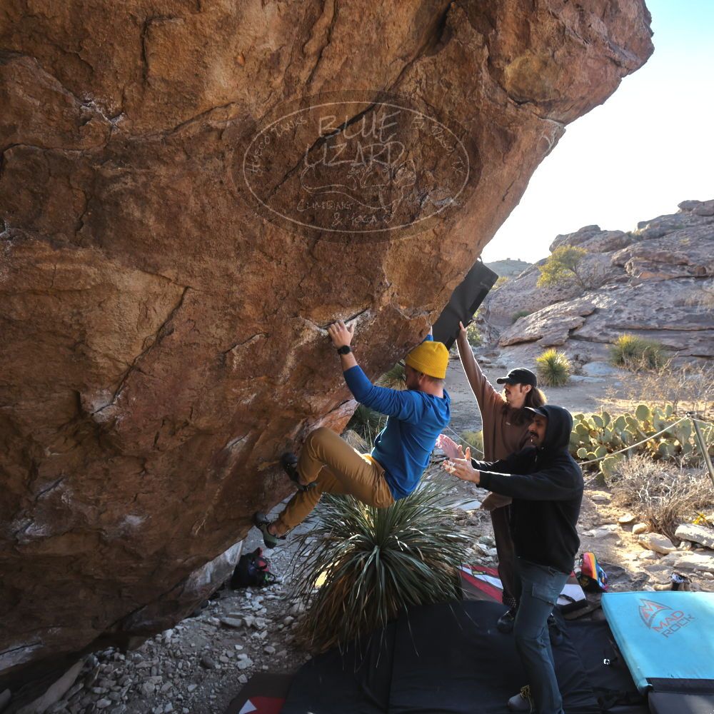Blue Lizard Climbing and Yoga Hueco Tanks guiding on February 1, 2025, with Bryan, Corey, Craig & Gisella, Justin, Kayvon, Linwen & Scott |