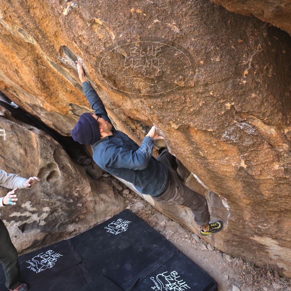 Blue Lizard Climbing and Yoga Hueco Tanks guiding on February 21, 2025, with David, Franky, Pedro, Tony, and Vikash