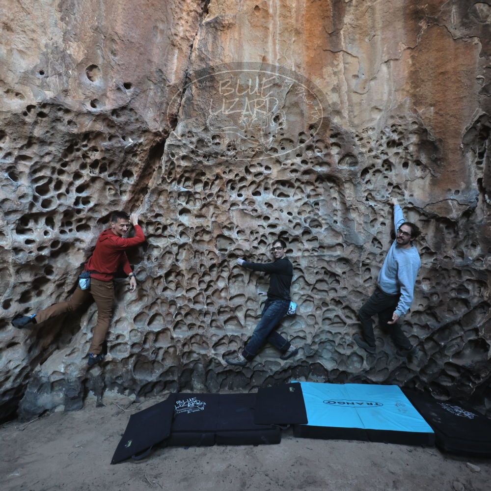 Blue Lizard Climbing and Yoga Hueco Tanks guiding on March 8, 2025, with Adam, Bri, Dan & Chris & Eric, Emily & Louis, and Kayvon |