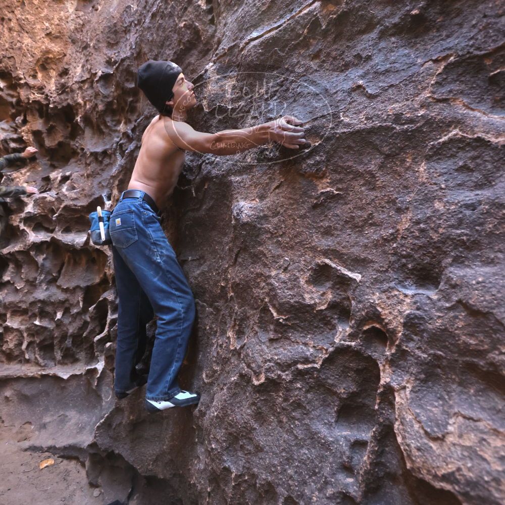 Blue Lizard Climbing and Yoga Hueco Tanks guiding on March 16, 2025, with Ash, Ben, Brianna, Matthew, and Riley