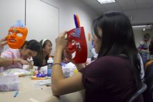Stephanie Luu, with Hannah Jones' mask in the foreground.  Domestic violence expressive arts workshop for survivors and friends of survivors of domestic and relationship violence.