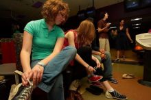 Brooke Garvey (left) and Kristen Ellefson tying their shoes before bowling.  Alpha Xi Delta held a sock hop themed date night at the Austin 300 bowling alley, Thursday night, March 29, 2007.