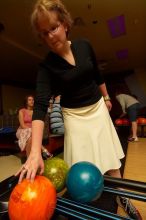 Heidi Frank reaching for a bowling ball.  Alpha Xi Delta held a sock hop themed date night at the Austin 300 bowling alley, Thursday night, March 29, 2007.