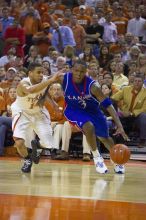 UT sophomore D.J. Augustin (#14, G) defends KU senior Russell Robinson (#3, Guard).  The University of Texas (UT) Longhorns defeated the University of Kansas Jayhawks 72-69 in Austin, Texas on Monday, February 11, 2008.