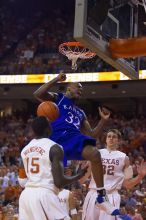 KU senior Darnell Jackson (#32, Forward) dunks over UT freshman Alexis Wangmene (#15, F/C) and UT junior Connor Atchley (#32, F/C).  The University of Texas (UT) Longhorns defeated the University of Kansas Jayhawks 72-69 in Austin, Texas on Monday, February 11, 2008.