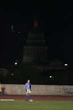 UT senior Dianna Pfenninger (#8, Goalkeeper) takes a goal kick with the capitol in the background.  The University of Texas women's soccer team tied 0-0 against the Texas A&M Aggies Friday night, September 27, 2008.