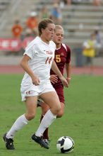 UT senior Kasey Moore (#14, Defender) takes the ball upfield in the second half.  The University of Texas women's soccer team won 2-1 against the Iowa State Cyclones Sunday afternoon, October 5, 2008.