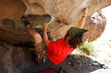 Beth Marek rock climbing on No One Gets Out of Here Alive (V2) in Hueco Tanks State Park and Historic Site during the Hueco Tanks Awesome Fest 2010 trip, Saturday, May 22, 2010.
